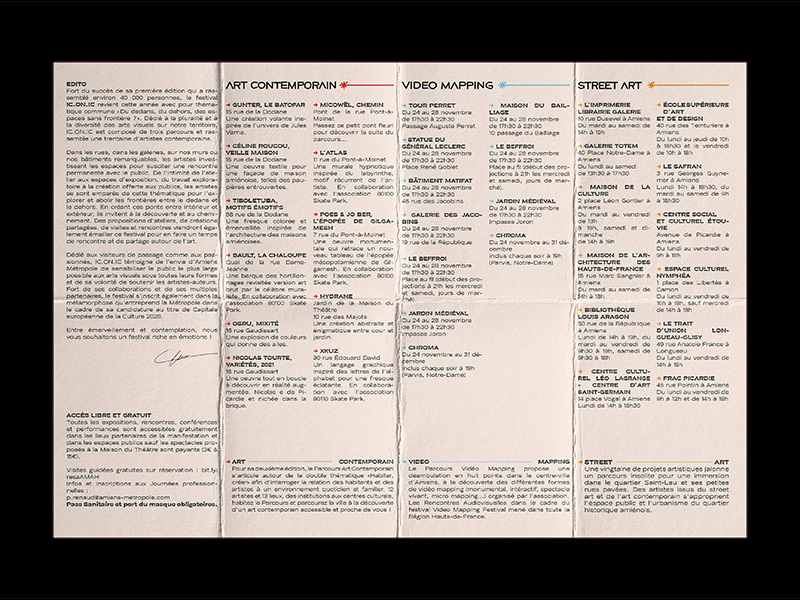 Dédié à la pluralité et à la diversité des arts visuels sur notre territoire, IC.ON.IC est composé de trois parcours et rassemble une trentaine d’artistes contemporains. Dans les rues, dans les galeries, sur nos murs ou nos bâtiments remarquables, les artistes investissent les espaces pour susciter une rencontre permanente avec le public.