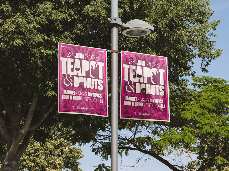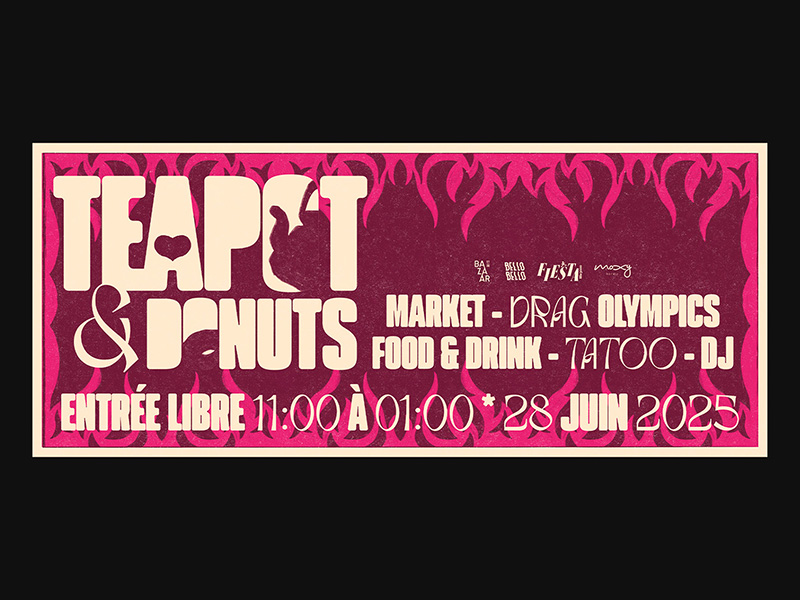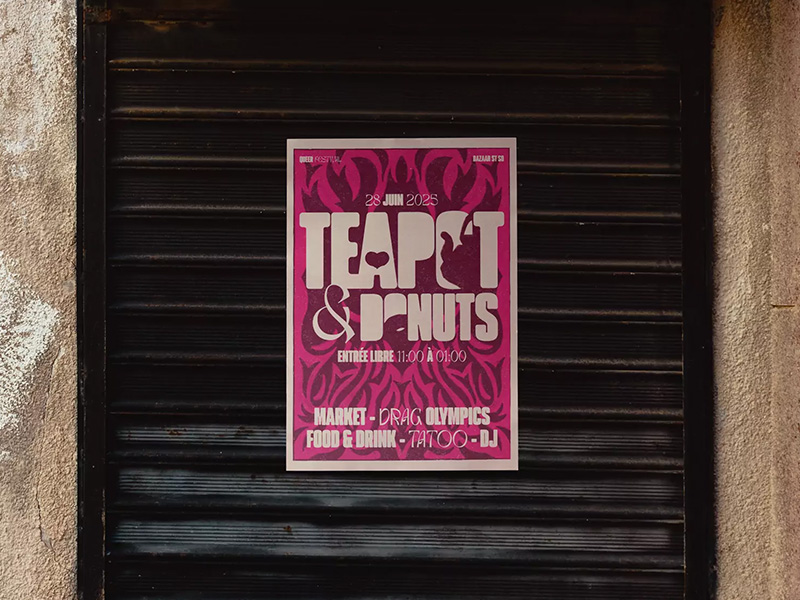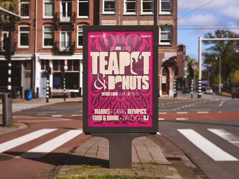 Teapot & Donuts, c’est un festival queer qui célèbre la diversité, la fête et les expressions plurielles des identités. Pour cette identité visuelle, j’ai voulu créer un univers joyeux, inclusif et décalé, à l’image de l’événement. L’objectif : affirmer haut et fort les valeurs du festival tout en captant l’attention, sans jamais perdre en tendresse ni en fun.